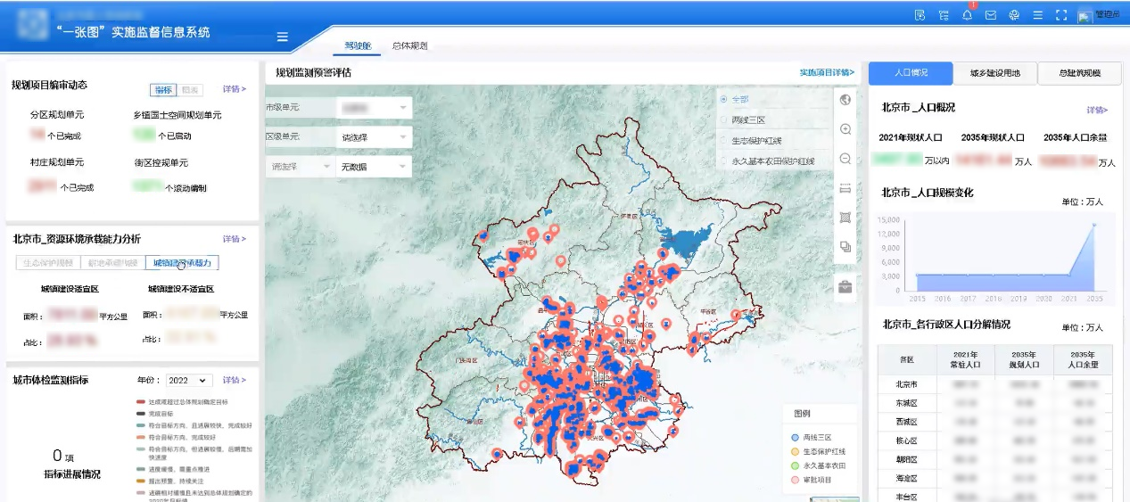 符合国土空间规划”一张图“实施监督系统建设规范,形成了三个应用板块的技术能力,国土空间规划全过程管理,将成果报送、规划审查、规划批复、成果归库纳入全过程管理,强化规划成果质量审查,优化成果入库管理;规划一张图应用板块,以规划成果为核心,整合全市基础现状、规划实施、规划监督和空间关联数据等数据服务,支撑基于一张图的查询和分析;规划实施监督板块,结合构建的指标体系,对规划编制、规划实施和实施监督提供监测预警和分析评估等应用。