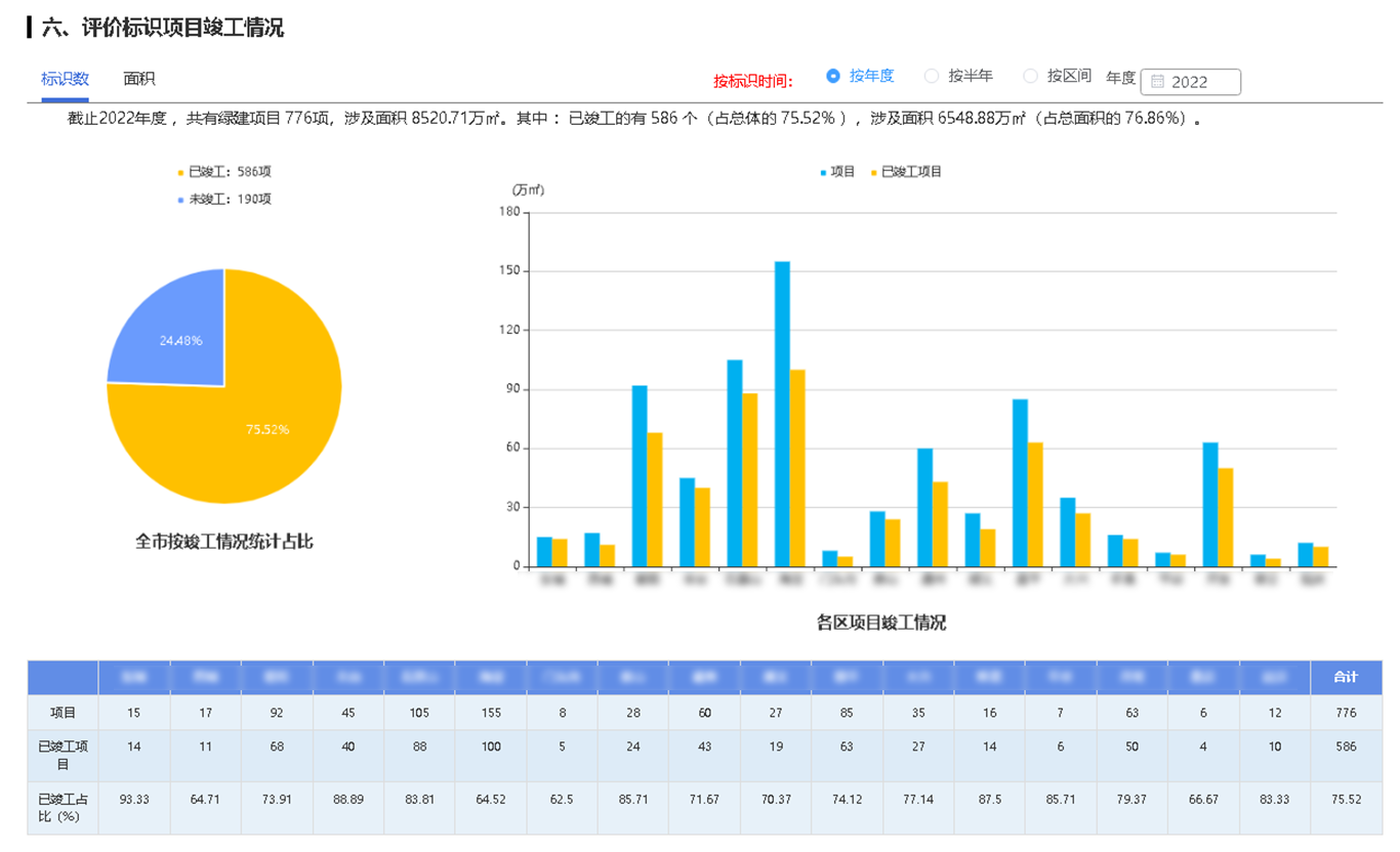 绿色建筑统计分析:对绿色建筑工程的开工总体情况、竣工总体情况、各区绿色建筑工程的开工总体情况、各区竣工总体情况、评价标识项目总体情况、复核情况等进行统计。